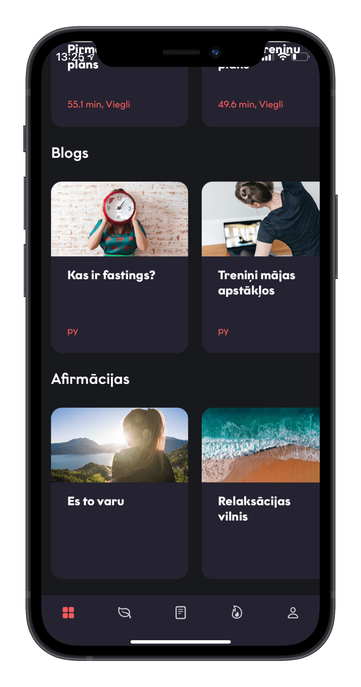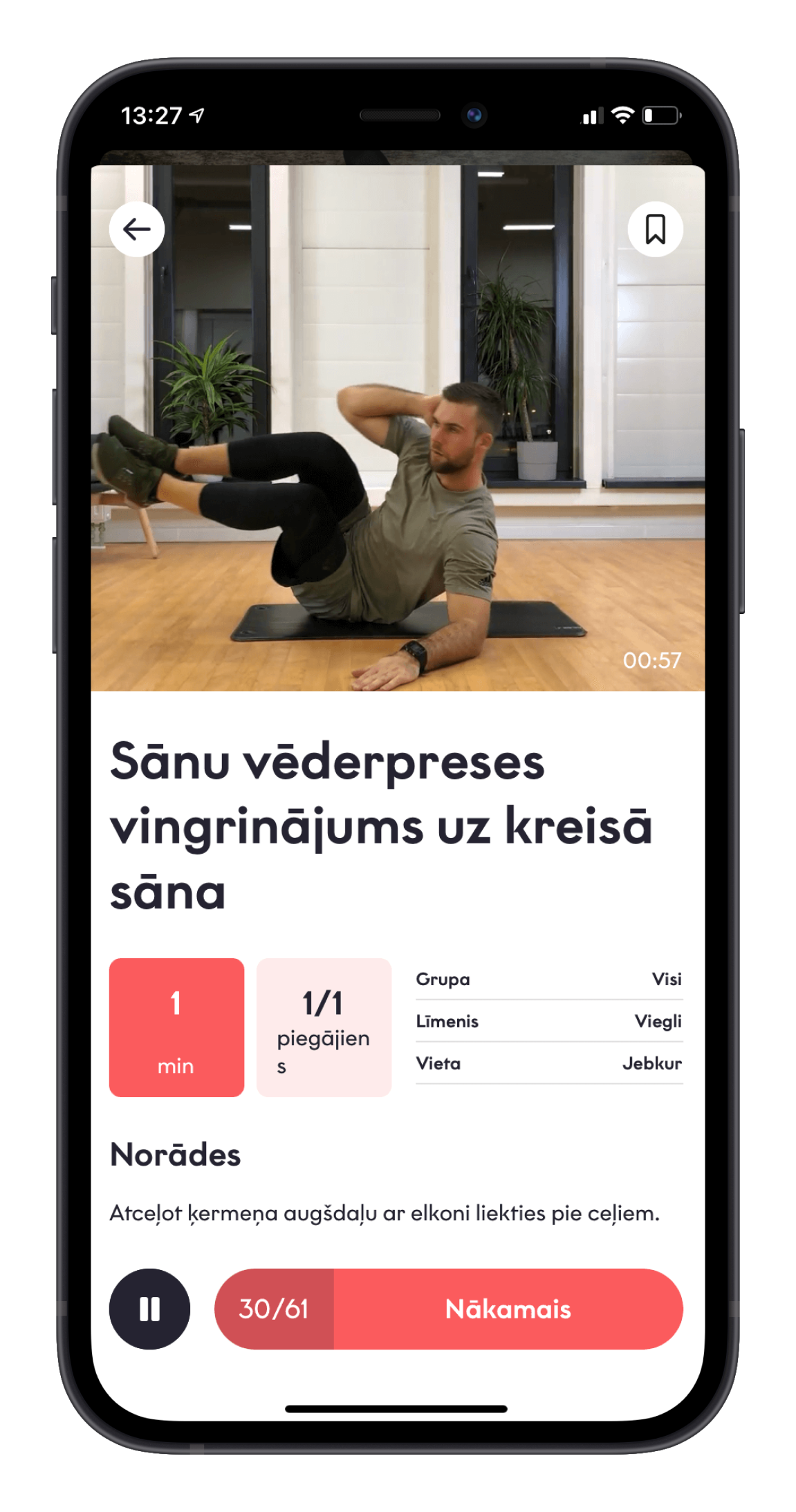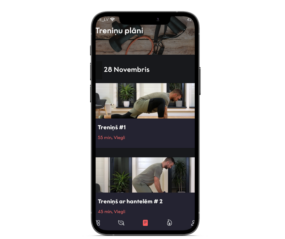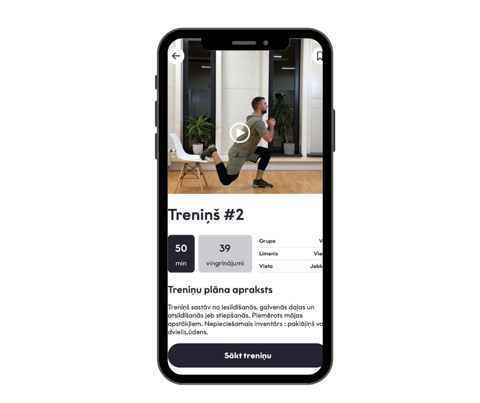Aplikācijā šobrīd iekļauti vieglas/vidējas intensitātes treniņi, līdz 60 min.